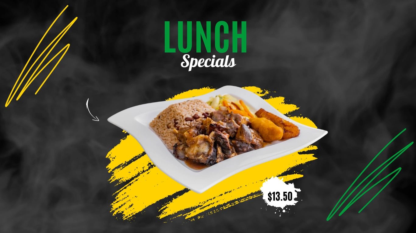 Lunch hour specials from 11:00am to 2:00pm includes CURRY CHICKEN, STEW CHICKEN & JERK CHICKEN.